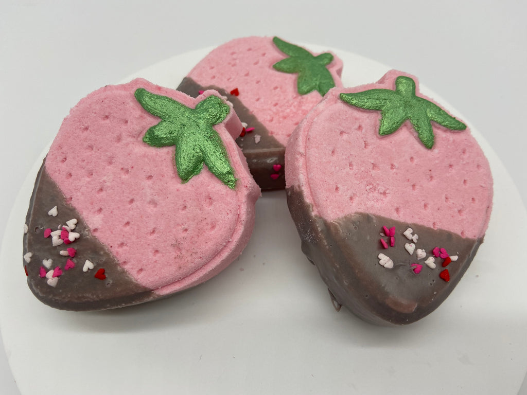These adorable handmade and hand painted Dipped Strawberry Bath Fizzies will be a relaxing addition to your self care bath time. They’re scented in decadent and sweet strawberry champagne. The dip is a melt and pour soap, so you will get just a bit of bubbles from it.